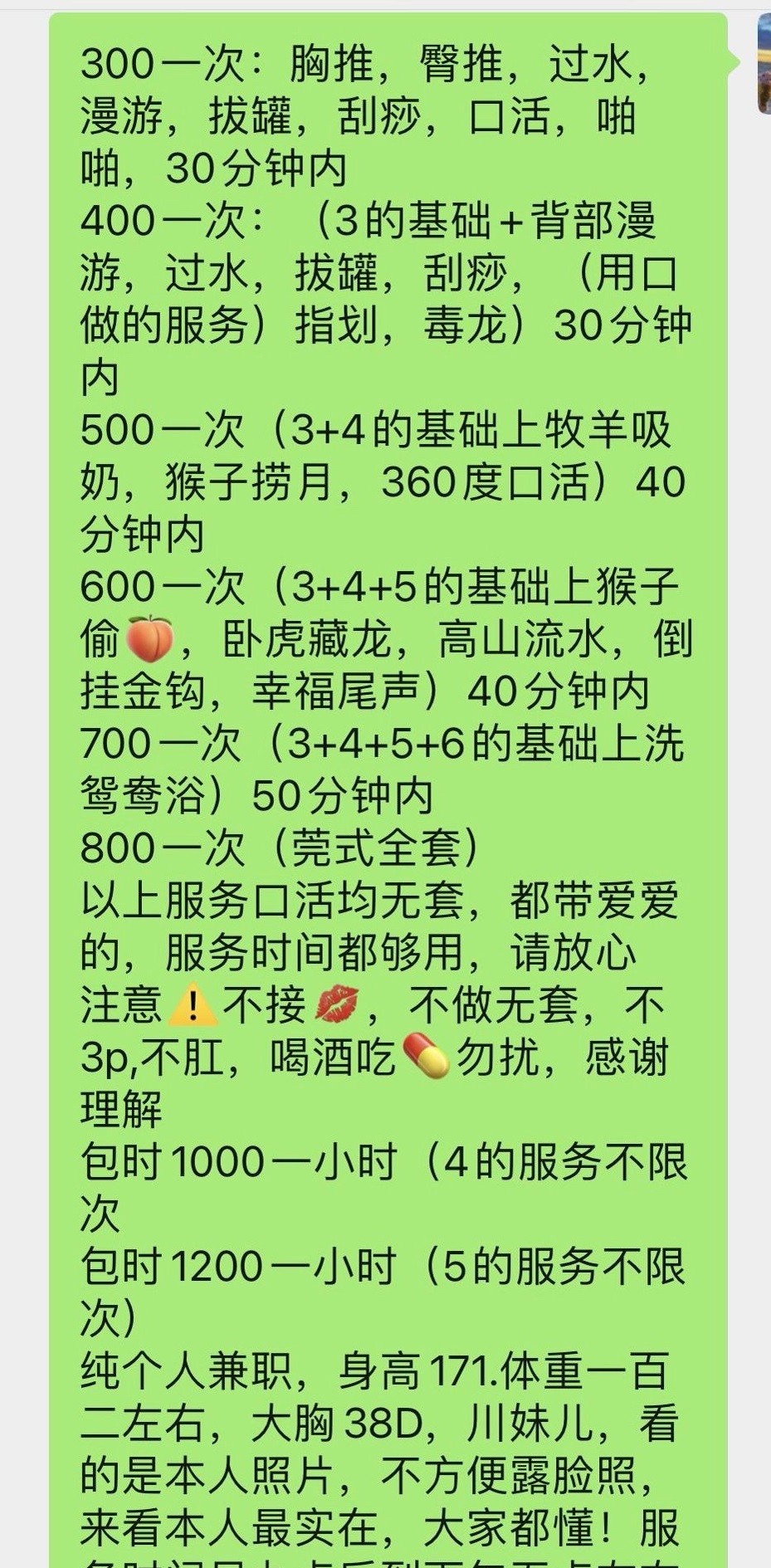 微信遥控上门自己租的房子,开门短发大高个胸还可以吧,挺瘦溜的,做的300的觉得性价比高,简单擦洗躺下开始胸推臀推,口活挺舒服的还舔一会蛋蛋,带套开干,正常体位做了一会后入式大长腿感觉挺爽,性价比不错,在高价位的也没体验,觉得300就可以